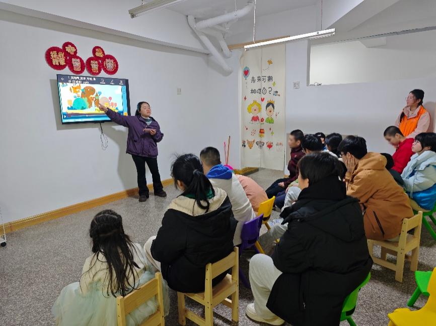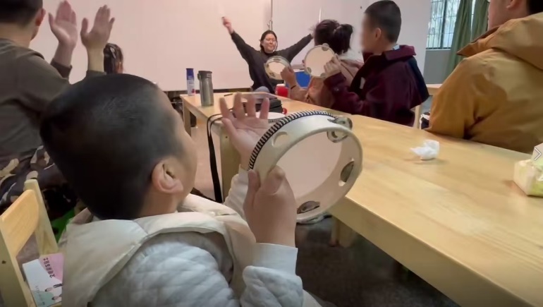 1月18日上午,特教老师和志愿者们为小朋友们带来“敲敲过新年”主题的音乐课。老师先带着小朋友们做起了一套有鼓点的手势舞操,在志愿者的引导下,小朋友们紧跟老师的节奏,做出一个个流畅且充满韵律动作,仿佛是在为即将到来的新年奏响序曲。接着,老师从一旁拿出了一个大鼓,沉稳的鼓声随着老师的击打在教室里回荡,小朋友们眼睛里闪烁着兴奋的光芒,被那激昂的鼓声所感染。之后,老师给每位小朋友都分发了一个小手鼓,在老师的指导与志愿者的协助下,小朋友们认真学习如何跟着旋律敲击小手鼓并表演相应的手势,渐渐地,他们掌握了节奏,手上的动作也慢慢协调起来,整个教室都洋溢着一种欢乐与活力的氛围。