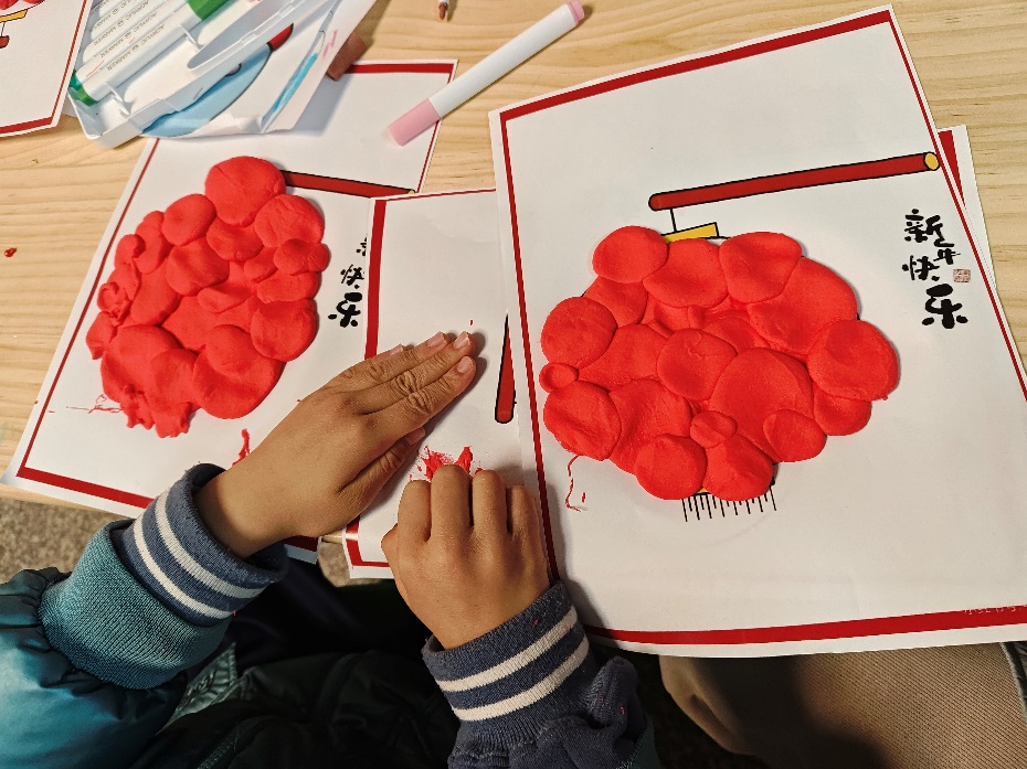 紧接着,教师以一幅描绘春节期间家门上的装饰画作为课堂导入,画中火红的灯笼尤为醒目,老师引导小朋友们可以参照画中的灯笼制作独属自己的灯笼。在志愿者的协助下,小朋友们拿起红色的黏土,在纸上空白的灯笼轮廓内细致填充,一个个火红的灯笼逐渐跃然纸上。在制作的过程中,小朋友们不仅锻炼了动手能力,还深刻感受到了中国传统文化的魅力与韵味。